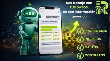 Rex es el asistente de inteligencia artificial integrado en Rentexa. Pero a diferencia de herramientas genéricas como ChatGPT, Rex no trabaja con información general. Rex trabaja con tus datos: tus propiedades, tus ingresos, tus gastos, tus contratos, tus documentos.